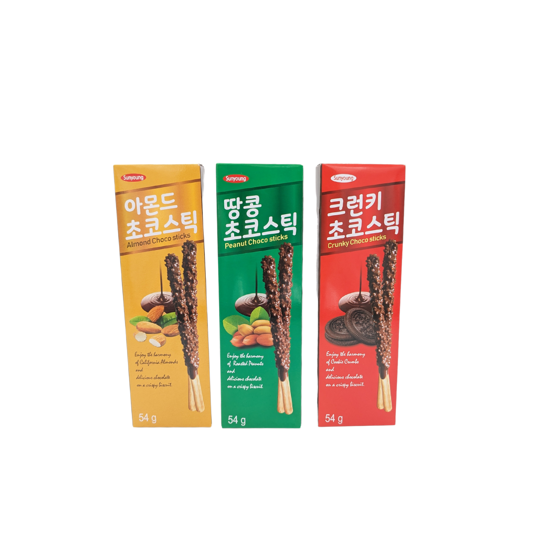 Les bâtonnets coréen de la marque SUNYOUNG sont des biscuits mikados similaires aux fameux Peppero. Ils consistent en un biscuit fin en forme de barre et recouvert d'un glaçage au chocolat. Les nappages de ces biscuits coréens sont variés et plairont à toute la famille, aux plus petits comme aux plus grands. À la fois gourmands et croustillants, les bâtonnets chocolat vous feront immédiatement voyager en Corée du Sud.