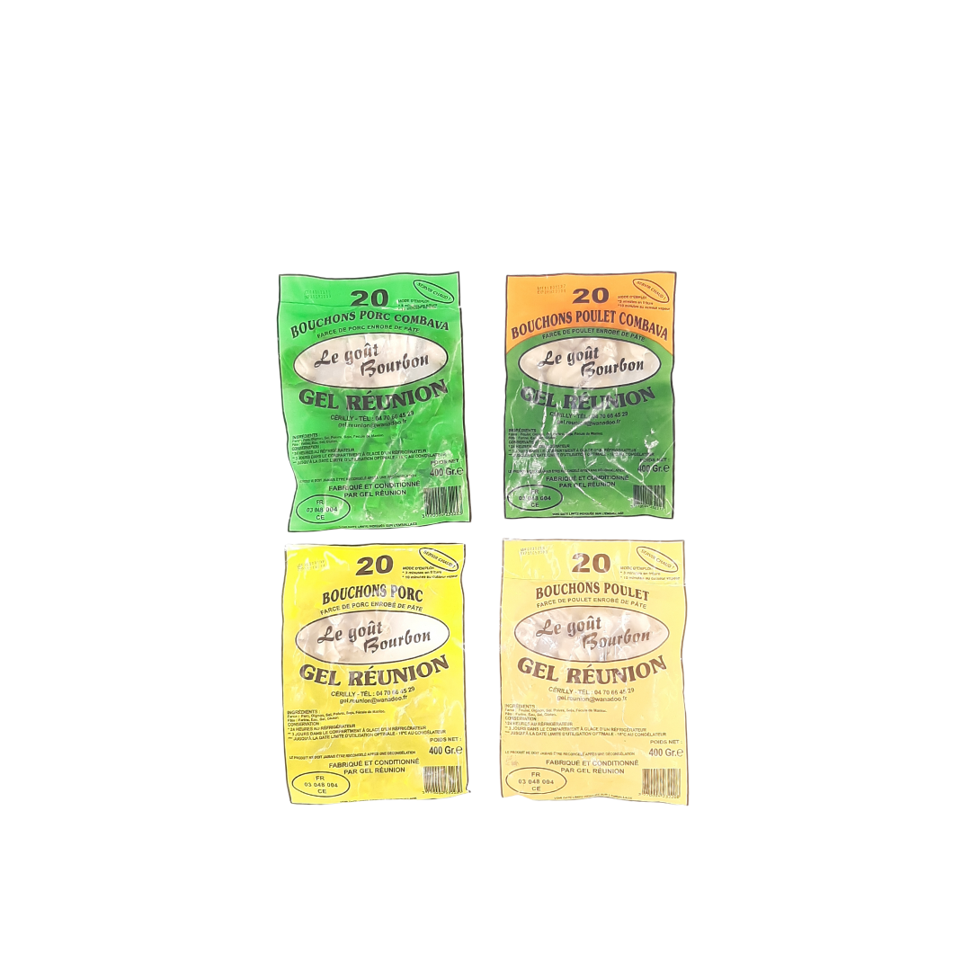 Les bouchons réunionnais sont des bouchées constituées de farce à la viande enrobée d'une pâte légère. Froids ou chauds, en entrée ou bien en plat, seuls ou ajoutés à vos préparations, les bouchons réunionnais peuvent être consommés de toutes les manières. Riches en saveurs et particulièrement parfumées, ces bouchées de viande éveilleront vos papilles. Le combava, présent dans certains de nos bouchons, apporte une pointe d'acidité qui vous fera voyager.