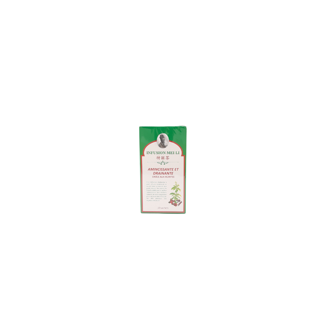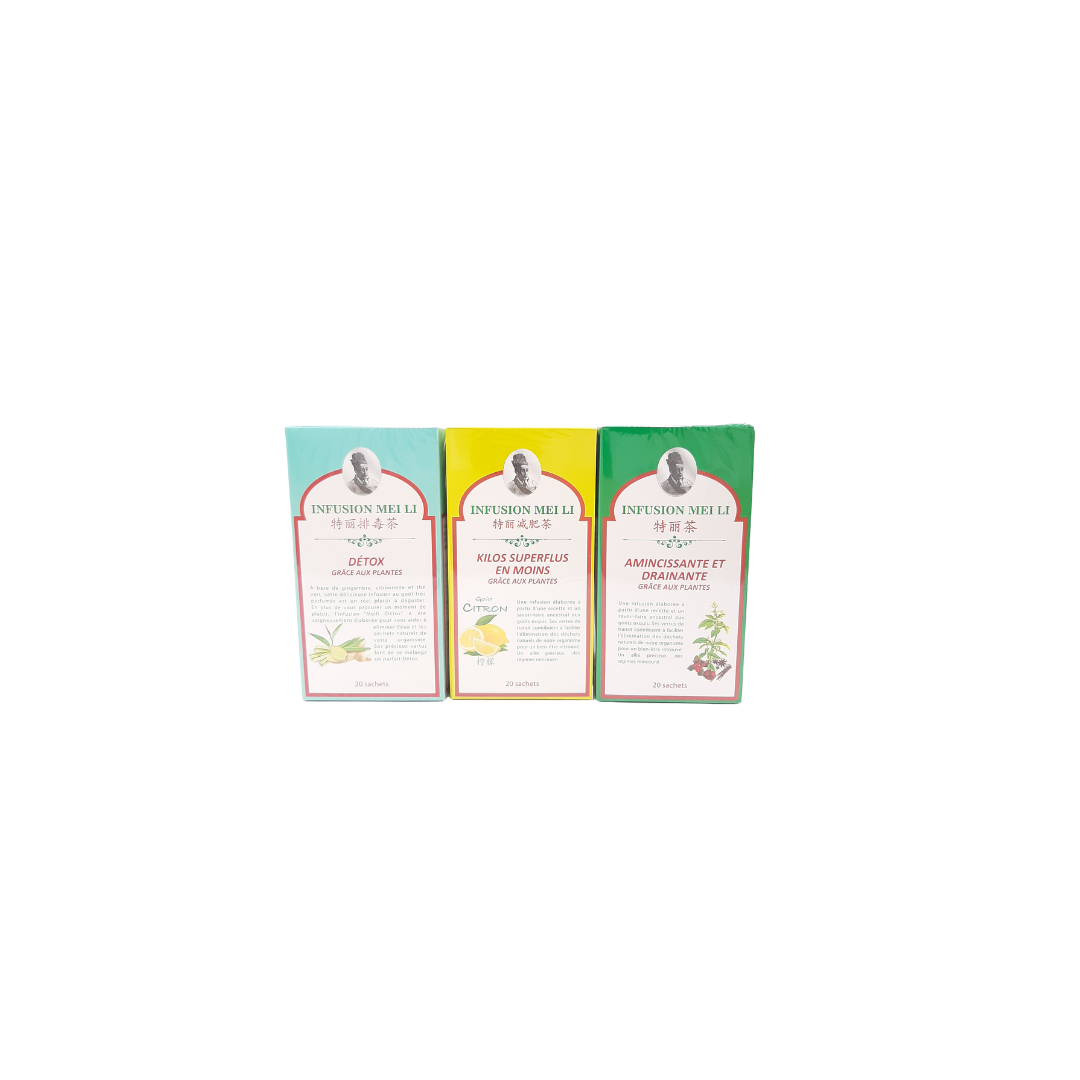 Les Infusions MEI LI sont élaborées à partir d'une recette et d'un savoir-faire ancestraux. Ses multiples vertus aident à l'élimination des déchets de notre organisme. Les infusions MEI LI sont donc de parfaits alliés pour tous les régimes minceur. Chaque plante présente dans les infusions MEI LI est récoltée à la main et soigneusement sélectionnée pour ses qualités et bienfaits exceptionnels.En plus de vous procurer un moment de plaisir, les tisanes MEI LI vous apporteront un maximum d'efficacité.