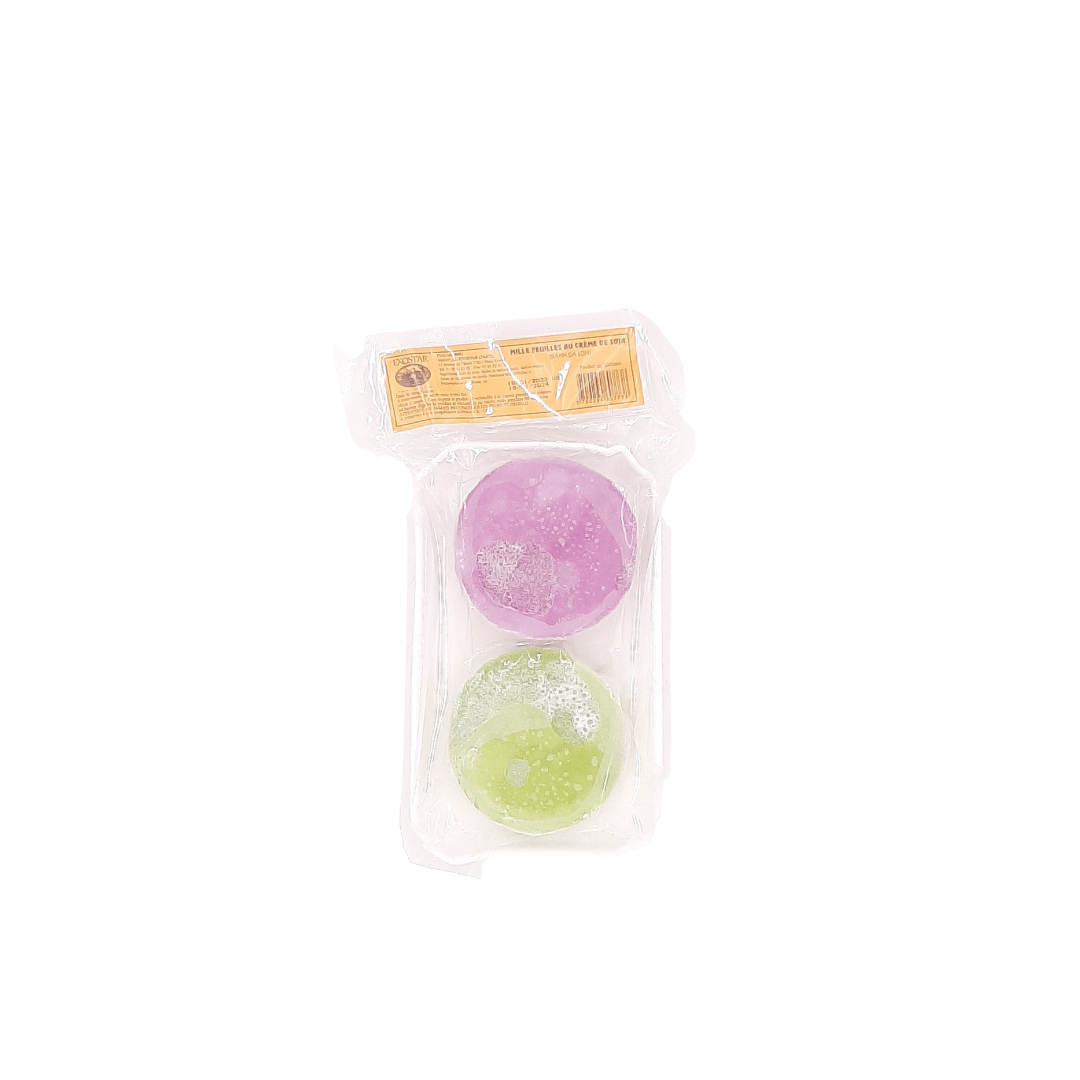 Les milles feuilles à la crème de soja, appelés "Banh Da Lon", est un dessert de street food vietnamienne. Il s'agit d'un gâteau aux deux couleurs et à la texture particulièrement gélatineuse. La première couche est constituée d'un mélange aromatisé au pandan tandis que la seconde couche se compose d'haricots mungo et de lait de coco. Gourmand et intriguant, le mille feuille à la crème de soja plaira aux enfants comme aux parents. Nos Banh Da Lon de la marque EXOSTAR seront la collation parfaite pour vos pauses goûter !