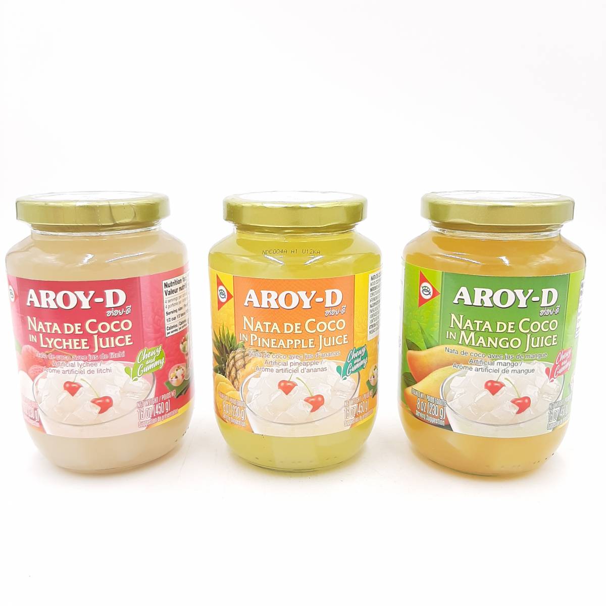 La nata de coco est un produit gélatineux et translucide obtenu à partir de fermentation d'eau de coco. Elle est principalement utilisée dans les bubble tea à la place des perles fruitées ou des perles de tapioca. La nata de coco aromatisée peut accompagner tous vos desserts mais également vos cocktails préférés. De part sa forte teneur en vibres et en vitamines, la nata de coco présente de nombreux bienfaits. Associées à la gourmandise des fruits, nos natas de coco aromatisées AROY-D apporteront croquant et fraîcheur à toutes vos recettes sucrées.