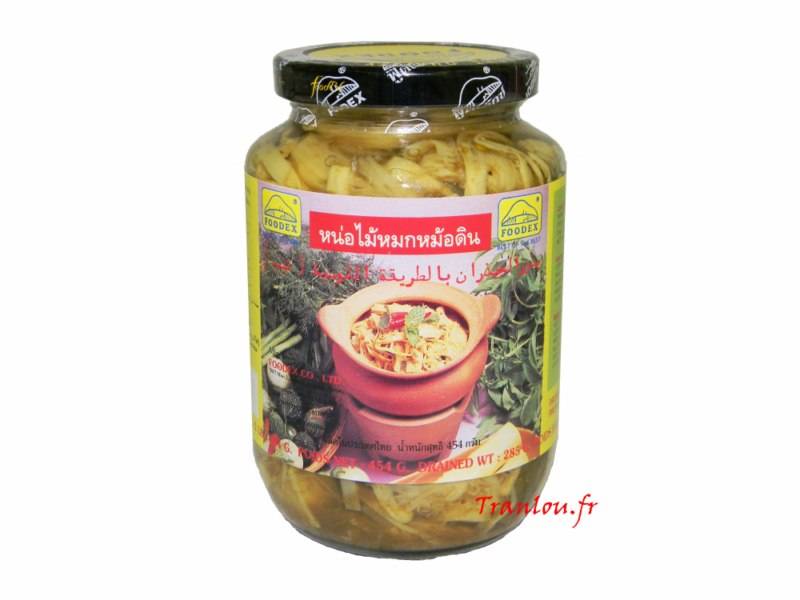 Ingrédients : pousses de bambou (pointes), eau, sel, feuilles de Yanang, piment, basilic, tamarin vert, sucre.