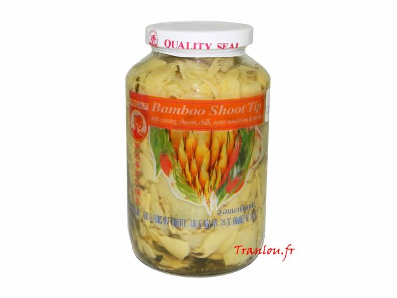 Ingrédients : pointes de pousses de bambou (62%), eau (21,8%), extrait de feuilles de Yanang (5%), sel (3%), feuilles de basilic (2%), cha-om (2%), tomate (2%), champignons d'huître (1%),...